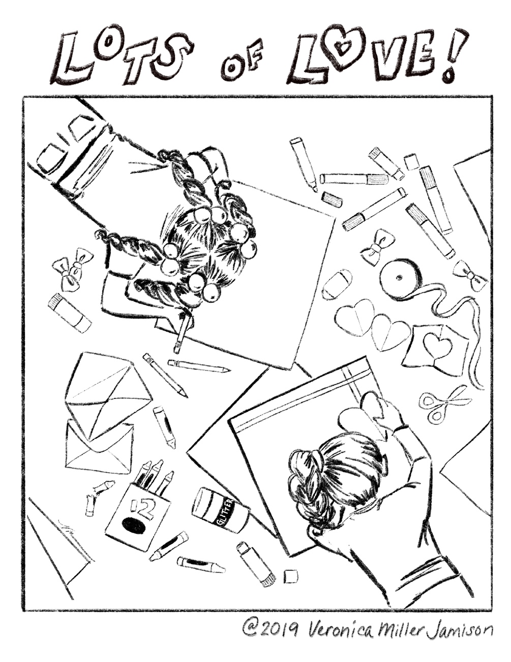Two friends send special notes to their favorite relatives. Are they writing to Mom, Dad. Grandma or Grandpa? Maybe they're writing to their favorite teacher, a sibling, aunt or cousin. They have a lot of fun supplies, like paper hearts, ribbons and glitter. And they're having a bunch of fun making these sweet little surprises for their favorite people.